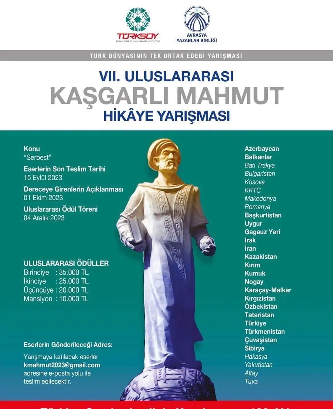 Devamını okuTürk Dünyasının Tek Ortak Edebi Yarışması Uluslararası Kaşgarlı Mahmut Hikaye Yarışması bu yıl Türkiye Cumhuriyeti'nin kuruluşunun 100. Yılı ve TÜRKSOY'un 30. Yılı Anısına düzenleniyor.
